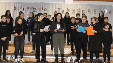 O centro quería entregarlle xa o galardón o curso pasado, porque o premio adoita coincidir coas Letras Galegas, pero a frenética axenda das cantantes non lles permitía vir recollelo. Esperouse ata agora, e pagou a pena. Onte, xoves, Aida Tarrío desembarcou na Nave da Música de Barro, onde a agardaba todo o colexio e onde foi recibida como unha auténtica heroína. Os nenos que investigaron sobre ela (que agora están en sexto curso) tiñan preparada unha sorpresa. Caracterizados coas vestimentas fetiche das Tanxugueiras, tiñan preparado un baile e as súas gorxas para entoar Terra. Aida Tarrío sumouse a cantar con eles.