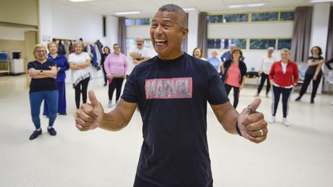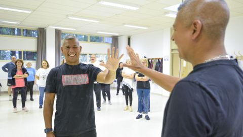 Los alumnos de bailoterapia Ana María Fraga, Xosé Carlos Morgade, Benilde Vázquez y Mari Carmen Pintos, con su profesor, Luciano Ricardo Gomes (a la derecha)