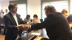 Ricardo Sánchez entró por primera vez en el despacho de la alcaldía como regidor de Miño, mientras en el salón de plenos se escuchaban gritos de «¡Vergüenza!»
