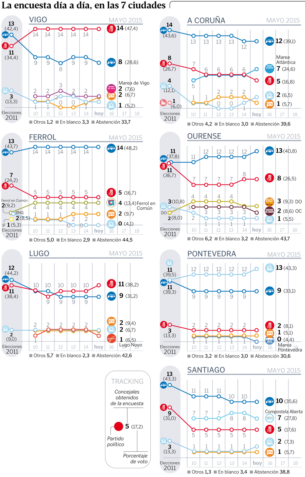 Las variaciones de orientación del voto que revela el trabajo de Sondaxe se concentran en Vigo, A Coruña, Ourense, Lugo, Pontevedra y Santiago