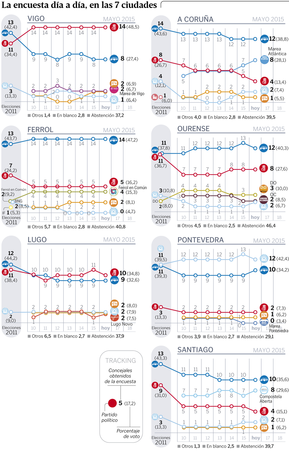 Las variaciones de orientación del voto que revela el trabajo de Sondaxe se concentran en Vigo, A Coruña, Ourense, Lugo, Pontevedra y Santiago