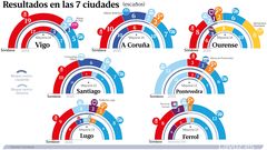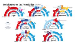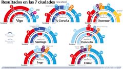 Con dos mayorías claras en Vigo y Pontevedra, el PP se impone por cierto margen en Ferrol; y el PSOE, en Santiago. Pero ambos partidos pelean en la foto «finish» por ser primera fuerza en A Coruña, Lugo y Ourense