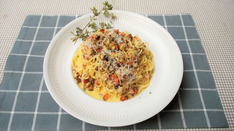 Una vez desmontado el mito de que hay que regar la carbonara de nata solo queda lanzarse a recetas que respeten la tradición pero le den un «punch» distinguido, como es el caso de este plato de Kibus
