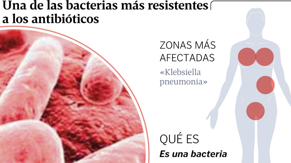 La bacteria «Klebsiella» Es una de las bacterias más resistentes a los antibióticos y causa neumonía, infecciones sanguíneas, del tracto urinario o en los tejidos blandos La Voz de Galicia La Voz 09/04/2016 05:00 h Facebook 0 Twitter 0 WhatsApp 0