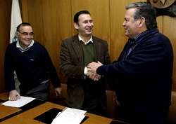 Crónica | La ruta a Santiago El regidor de Samos cedió el testigo a José Antonio García durante la reunión que mantuvieron los alcaldes