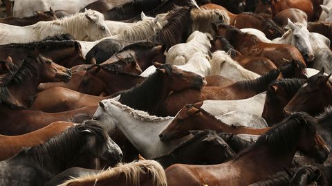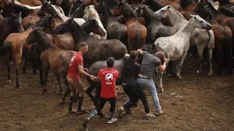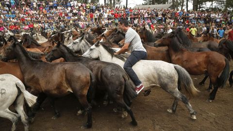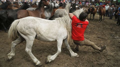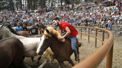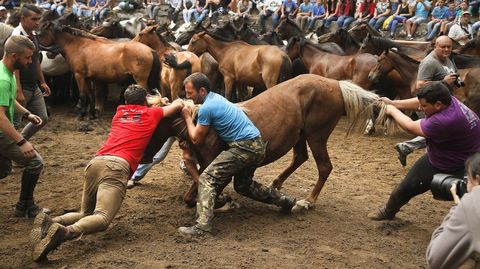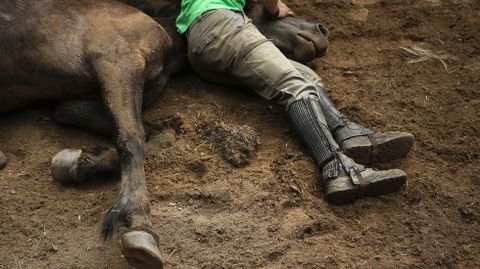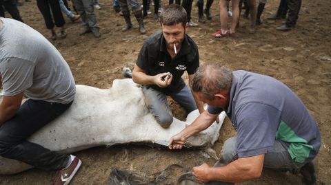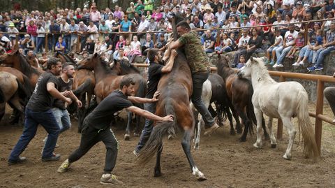 El presidente de la Asociación Cabalar Monte Acibal, Luis Calvo, advertía que el impacto del lobo se dejó sentir este año y el número de caballos salvajes fue inferior al de otras ediciones, donde se alcanzaban cerca de cuatrocientas cabezas. Este 2018 se quedaron en algo más de cien. Pese a ello, todo el proceso es un espectáculo digno de presenciar. Tanto la reunión previa de los equinos y sus potros como el trabajo que se ve en el curro que Amil estrenó en el año 2010 gracias a un acuerdo con los comuneros. Esta tradición ancestral que pone a prueba la relación del hombre con el caballo se reedita cada año el domingo siguiente a la rapa de Sabucedo (A Estrada), la más internacional de Galicia. En Amil no gustan las comparaciones. «Cada una es como es», dicen. Oficio y valentía son dos armas para enfrentarse al caballo. Este 15 de julio solo se vieron en acción apeitadores. «Temos un par de rapazas ás que lle gusta montar, pero aínda non se atreven», comentaba Luis Calvo tras la cita de la tarde, donde se raparon, marcaron y montaron.
