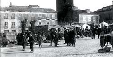 Protexidos do frío, nenos e adultos miran con curiosidade ao autor da imaxe, tomada fai case un século na praza do Campo de Ribadeo, posiblemente nun día de feira.