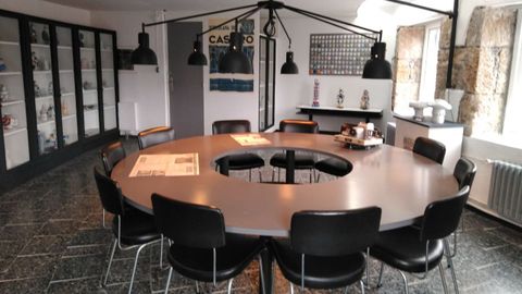 En la sala dedicada a Cerámicas do Castro se contempla la antigua sala de juntas, además de piezas que ayudan a entender la evolución estética de la producción de esta porcelana que es prestigio e icono gallego. Sorprenden las piezas de diseño relieve monférico rojo o las de portomarínico rojo y azul.