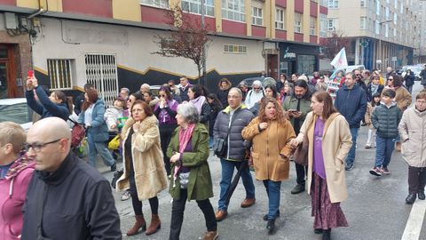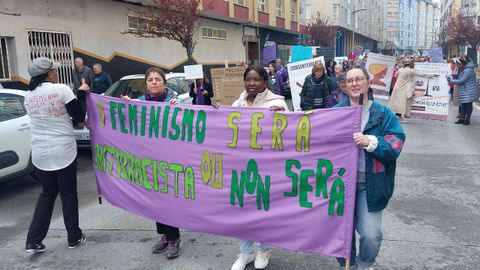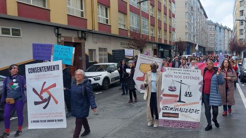 La marcha discurrió coreando mensajes reivindicativos: «A nosa loita de cada día, somos mulleres non mercadoría» y con grupos de mujeres portando pancartas y carteles: «O feminismo será antirracista ou non será», «Defendamos a igualdade. Fronte á violencia machista, loita feminista», «Consentemento: o meu corpo é meu, teño dereito a decidir e desexar», «Ni guerra que nos mate, ni paz que nos oprima», «Se ti traballas e eu tamén o mesmo soldo queremos ter», «O sistema xudicial e patriarcal non nos defende»... y también de algún partido político (BNG) y de colectivos como Palestina por la Paz.