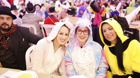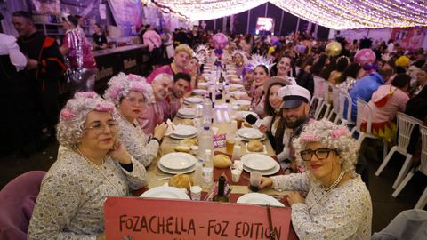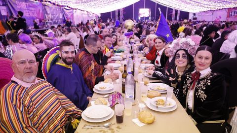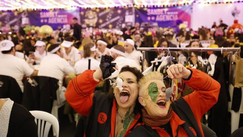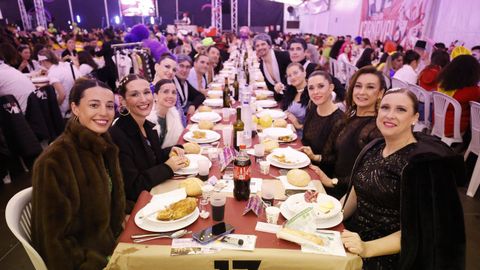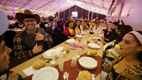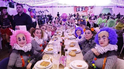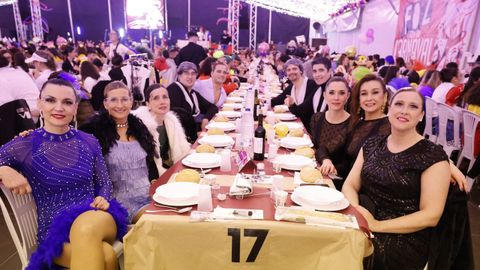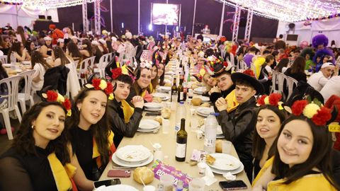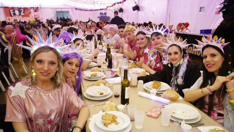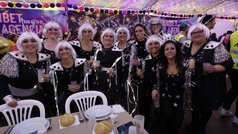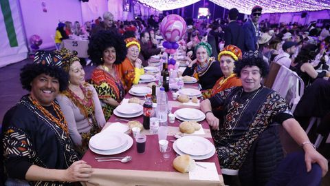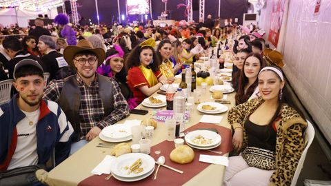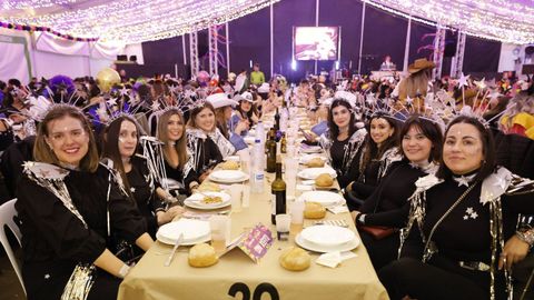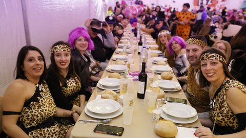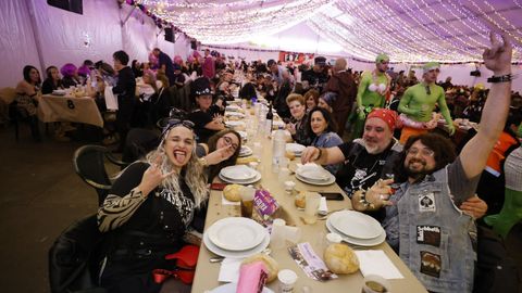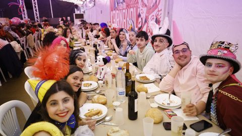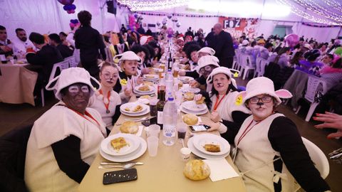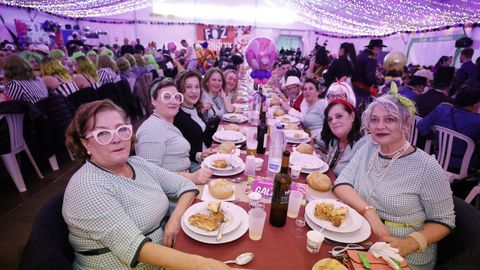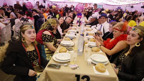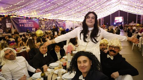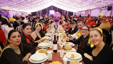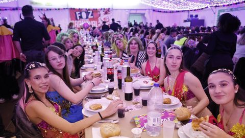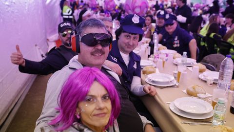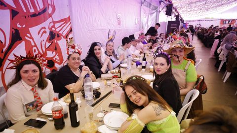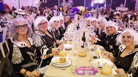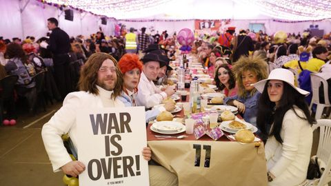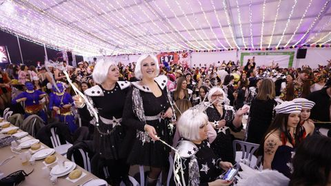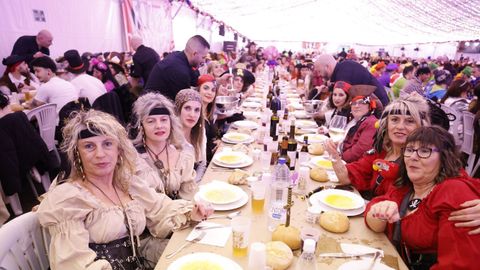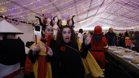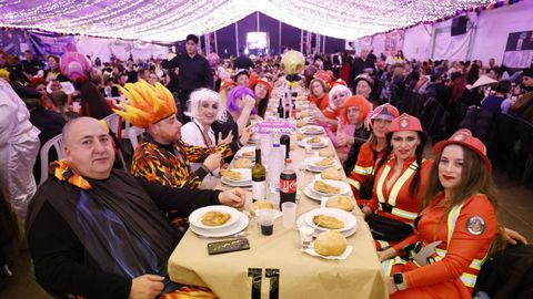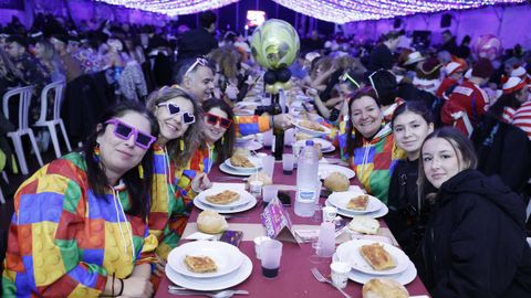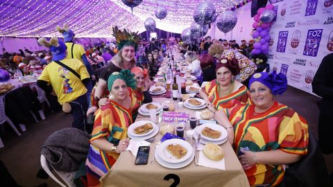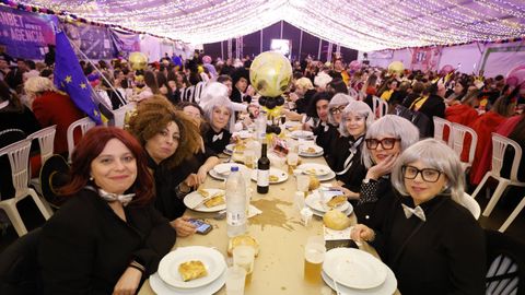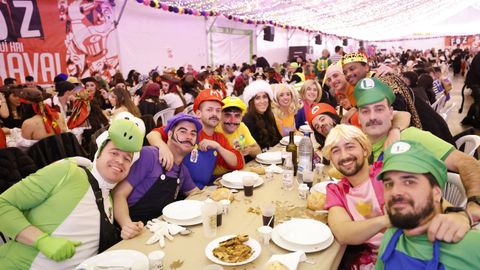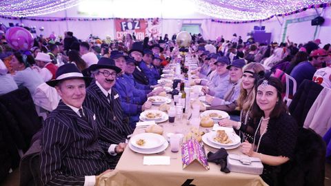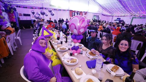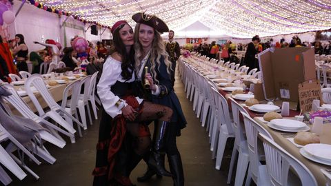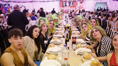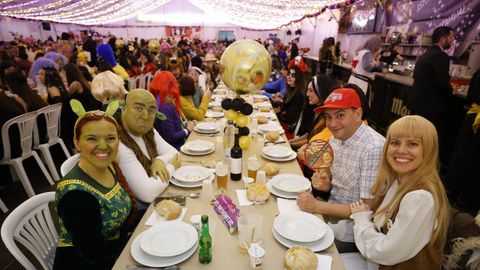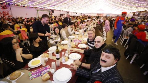 Laura Fanego y Cristina Otero ejercieron como las damas de Pérez en una noche para recordar. No faltaron en la cena personajes de videojuegos, mitos del pop pidiendo paz, disfraces basados en series ochenteras de televisión o referencias a la política internacional. Colorido, imaginación y mucho humor se dieron cita en un ágape que se ha convertido en la primera gran cita del Entroido focense.