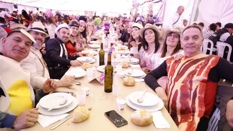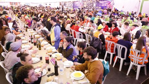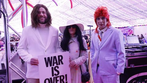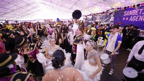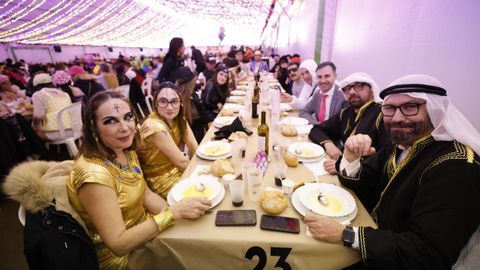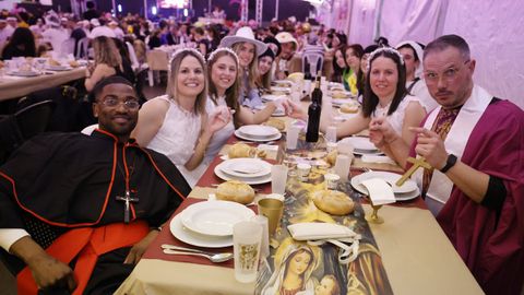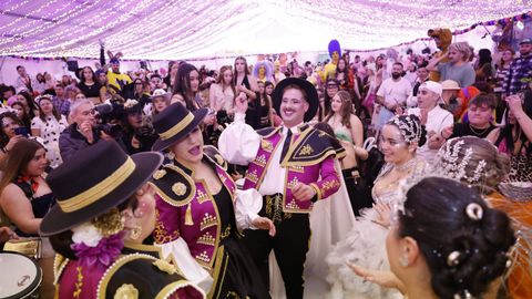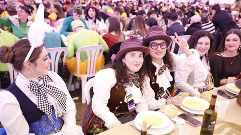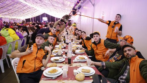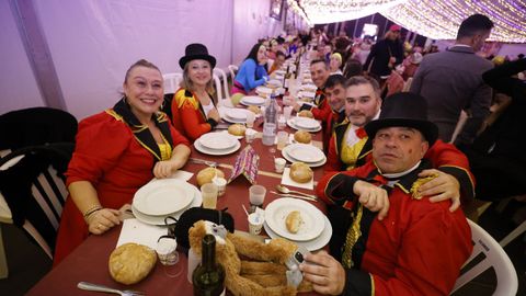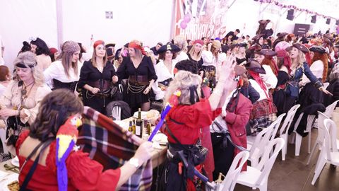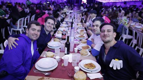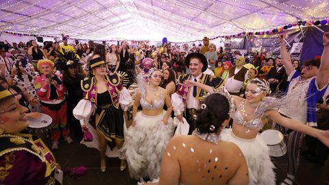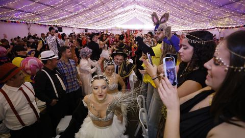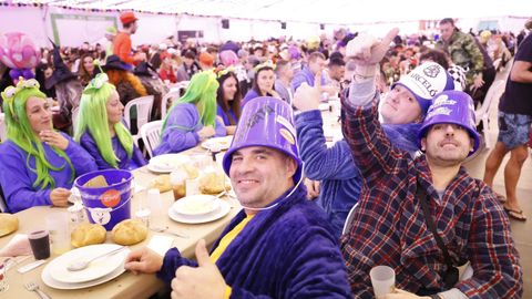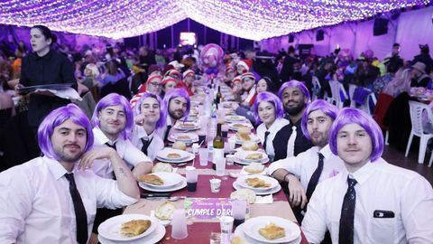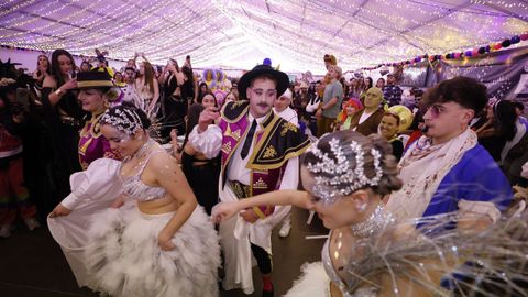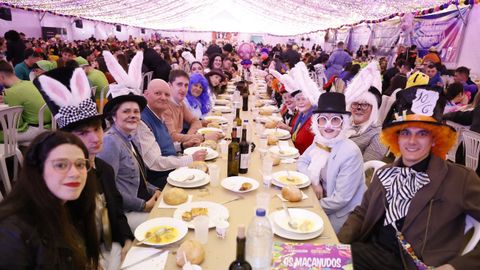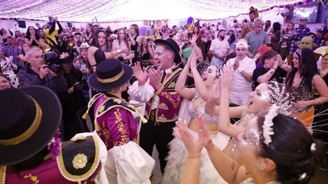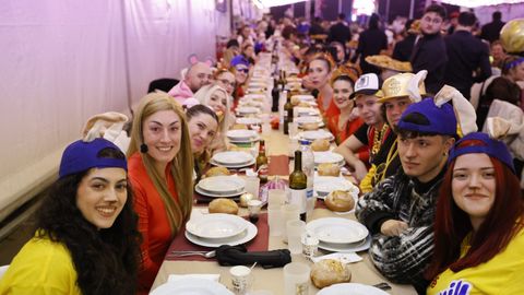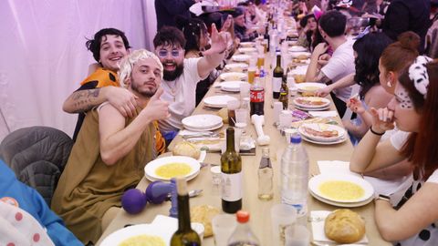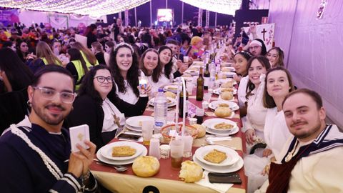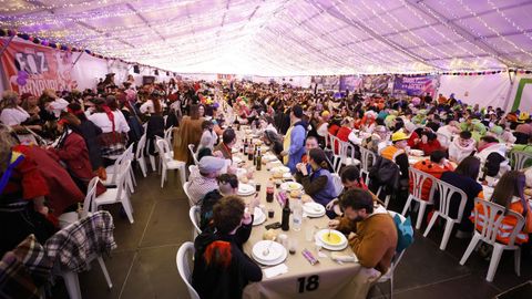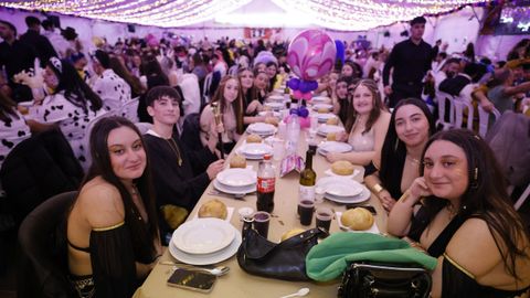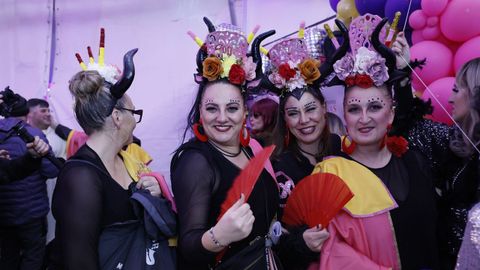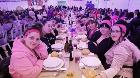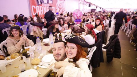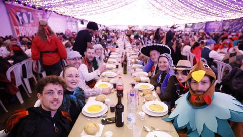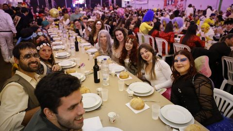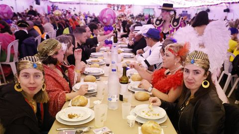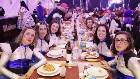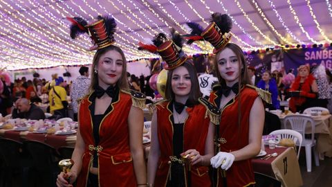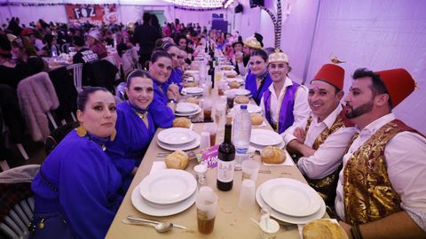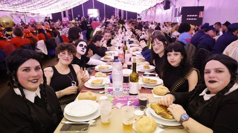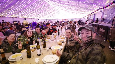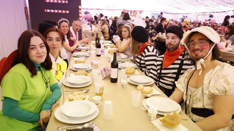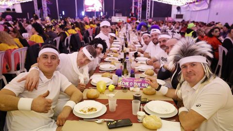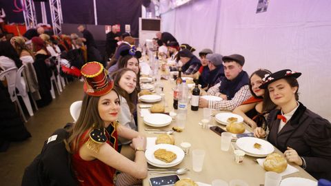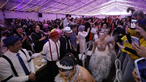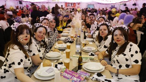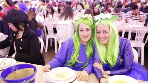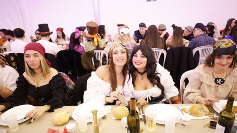 Laura Fanego y Cristina Otero ejercieron como las damas de Pérez en una noche para recordar. No faltaron en la cena personajes de videojuegos, mitos del pop pidiendo paz, disfraces basados en series ochenteras de televisión o referencias a la política internacional. Colorido, imaginación y mucho humor se dieron cita en un ágape que se ha convertido en la primera gran cita del Entroido focense.