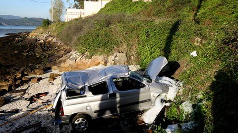 El accidente tuvo lugar hoy pasadas las cuatro y media de la tarde. El coche, en el que iban un hombre y una mujer, vendedores de frutas y hortalizas de Cambados, en lugar de tomar la curva de la Rosa se salió de la vía y cayó por un terraplén hacia al mar, al parecer, porque el conductor iba medio dormido. Tras voltearse, el vehículo cayó sobre unas rocas. Los ocupantes del coche fueron trasladados al hospital con heridas que en principio no eran graves, y para evitar un vertido de combustible al mar, se roció el coche con espuma.