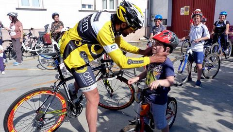 El colegio de Aralde vivió una inolvidable jornada de domingo de la mano del ciclista Gustavo César Veloso. Dentro del programa de estudio de las profesiones, el deportista fue a impartir una charla. Fue recibido sobre dos ruedas y con pancartas. foto cedida