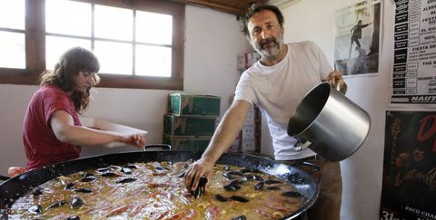 31 jul 2016 . Actualizado a las 05:00 h.No es fácil explicar lo que sucede dentro y fuera de El Náutico. A lo largo de sus 24 años de historia se han forjado todo tipo de expresiones para tratar de reflejar el espíritu de este lugar. Templo de la música, local legendario, una playa en un bar, un bar en una playa, paraíso para músicos... Pero cuando uno franquea su entrada lo que se despliega ante sus narices le lleva a concluir que, sencillamente, este es un sitio «de puta madre para la música, en el que se está muy bien». Quién mejor que Miguel de la Cierva, el tipo que echó a andar y mantiene viva esta locura, para describirlo. Es mediodía y alrededor de cincuenta personas buscan la sombra del porche que conduce a la arena. Otra buena parte de la clientela se acoda en la barra. Más allá, en la zona de conciertos, hay quien toma el sol. Pero aquí, en el recibidor, lo que burbujea es una tremenda paellera. Miguel distribuye los ingredientes tras calzar debidamente las patas de la mesa que soporta el pedazo de hornillo. «Mi padre -rememora- ya le daba bien a esto, y si lo piensas es normal, porque si te molan las cuchipandas y no tienes un cocinón, para más de treinta la paella es lo tuyo».