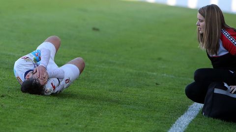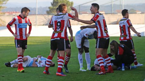 El ímpetu de los contactos generó un par de parones para asistir a futbolistas arlequinados en el suelo que acabaría con el colegiado añadiendo tres minutos antes del descanso, y Anxo marchándose lesionado en su hombro derecho en el minuto 33, sustituído por Iago Beceiro. Por banda izquierda, el coruñés entraría en la sucesión de casis que convirtieron a los visitantes en los animadores del tramo final de la primera parte. En dos asistencias cargadas de pólvora por Julio Rey y Fran Matos que la zaga del Céltiga desarmó a tiempo, y un disparo de fogueo de Beceiro. Angelo, en la prolongación, animaba a la tropa insular con un testarazo alto en el corazón del área rival en el primer córner de su equipo.