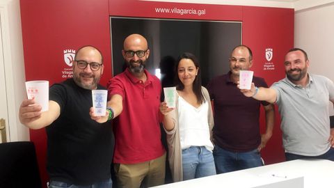 «Al final, mucha gente se lleva estos vasos a casa y los guardan a modo de recordatorio de la fiesta», explicaban ayer los hosteleros. Hablaban dos representantes de Ahituvi, que es la entidad que ha tenido la idea de enriquecer la fiesta con un guiño al medio ambiente. El Concello de Vilagarcía no solo ha recogido el guante, sino que lo ha hecho con entusiasmo. La concejala de Xuventude, Alba Briones, el de Medio Ambiente, Diego García, y el de Turismo, Álvaro Carou, apadrinaron la presentación de una iniciativa que se hará extensible a todos aquellos locales de hostelería que quieran sumarse a ella.