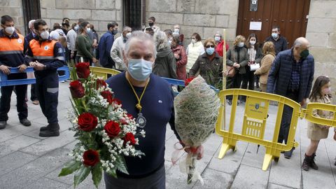 «Por favor que vayan pasando los que tengan números entre el 30 y el 40», pedía un operario municipal situado a la puerta del templo. Se iba a celebrar la misa de doce y, a la entrada, había una pequeña cola de fieles esperando a que dijeran el número que previamente habían recogido en la caseta de Protección Civil. Los operarios de emergencias eran también los encargados de recoger las ofrendas de los fieles que no tenían entrada para la misa y que, por lo tanto, no podían acceder al templo. «¿No puedo entrar? Solo quiero ir a dejar la ofrenda», pedía una señora en la puerta. «Nosotros se la entregamos», le respondió uno de los operarios mientras le recogía las flores.
