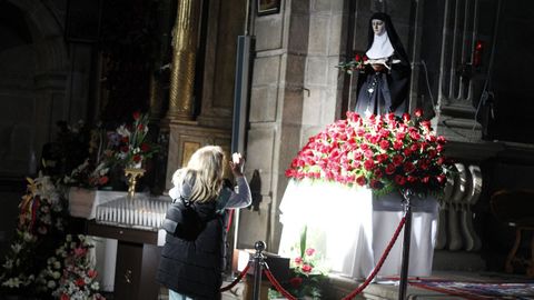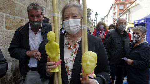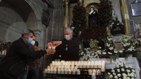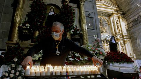 Una vez en el interior de la iglesia, los fieles hacían cola para dejar sus limosnas o encender una vela. Pero no había tampoco la posibilidad de acercarse a la santa para tocarla, solo se podían dejar las limosnas. En los bancos, la gente se sentaba ordenada y de tres en tres, respetando la distancia de seguridad. Y aquellos que no encontraban sitio eran acomodados por los trabajadores municipales. En las primeras filas, una mujer lloraba emocionada, quizás por los favores concedidos. Y otra iba tan cargada de velas y ofrendas que resultó difícil aplicarle el gel hidroalcohólico en la entrada.