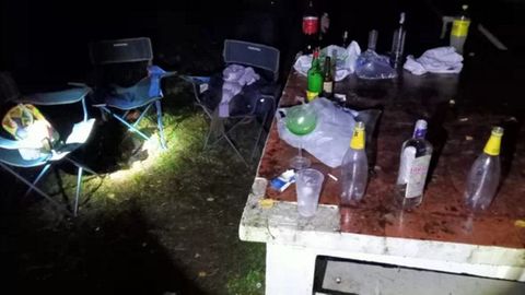 Cuando llegaron al lugar en el que se celebraba la fiesta, los agentes se encontraron con los restos de lo que había sido un botellón VIP. Las bebidas, sacadas de un buen botellero, habían sido dispuestas sobre un murete. A su alrededor se habían instalado varias sillas plegables dotadas de un bolsillo especial empleado, en este caso, para apoyar las consumiciones. Estas se bebían en vasos y en copas balón, de cristal.