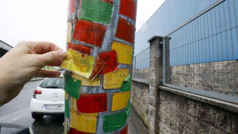 Esas dos opciones son las que se suelen tomar en general pero, para algunas cosas, queda claro que Vilagarcía es particular. Y para muestra lo que sucede en los alrededores de la estación de ITV que está en el polígono vilagarciano de Trabanca. Allí, las farolas llevan algunos años siendo el lugar elegido para dejar las pegatinas antiguas. Son decenas las que allí se agolpan, unas encima de otras y en varias farolas porque el espacio es limitado y las modas, incontrolables.