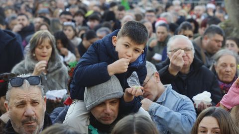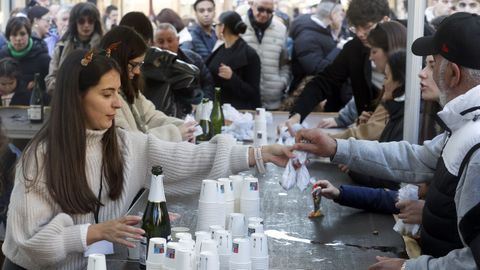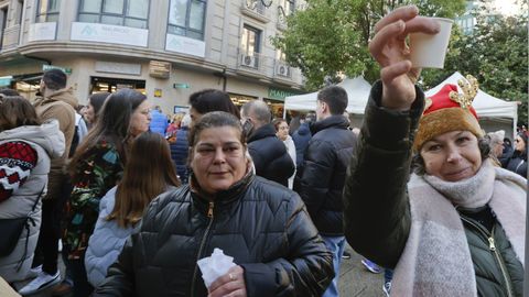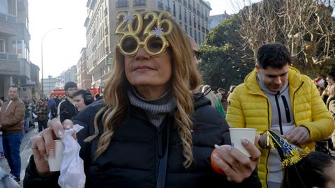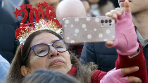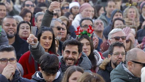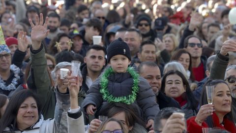 Los más duchos en el cálculo se habrán percatado a estas alturas de que las cuentas no salen y que el 1998 fue hace ya 27 años. Pero como también se encargan de recordarnos las crónicas y álbumes de la historia vilagarciana hubo dos ocasiones en las que la tradición se rompió. La primera, en el 2002, recién acontecido el desastre natural que supuso el Prestige. Ningún gallego tenía ánimos para celebrar nada. La segunda, en el 2020, por culpa de la pandemia mundial del coronavirus. Esas excepciones debieron saltarse en el carrusel de fotos emitido desde la gran pantalla colocada frente a la casa consistorial y que mostró estampas de la cita a lo largo de su ya no tan breve historia. Dos cosas dejaron claras: Vilagarcía parece haber hecho un pacto con la climatología, porque pocas ediciones fueron pasadas por agua —en la del 2025, a pesar del frío, brilló con ánimo el sol— y a sus vecinos les encanta brindar y catar uvas. De los 200 del primer año, a reunir millares.