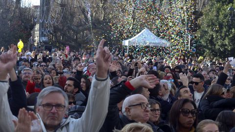 Al filo de los cuartos se escuchó la voz ya quebrada —y eso que aún queda mucha fiesta— del alcalde Alberto Varela bramar «¡Feliz 2026, Vilagarcía!» y reivindicar que, aunque esto de adelantar las uvas se haga ahora en muchos sitios, «nós fomos os primeiros». Mientras el púlpito se preparaba con tino para comer las doce y no atragantarse, Carlos Blanco se encargó de recordales formular un deseo por cada una. Algunos, pedirían aprobar esas dichosas oposiciones. Otros, que Altri nunca manche las aguas de nuestra ría. Muchos, que se ponga fin a cualquier guerra o genocidio que asole el mundo, porque el 2025 demostró que la paz y la humanidad están en crisis, pero también que los arousanos no se ponen de perfil ante la injusticia y el derramamiento de sangre. La última campanada dio paso al confeti y la celebración solo se detuvo para encontrar a Iago, un pequeño de ocho años cuya madre extravió, y que rápidamente fue localizado con ayuda de la multitud. Ya hay anécdota para cuando la tradición cumpla 50.
