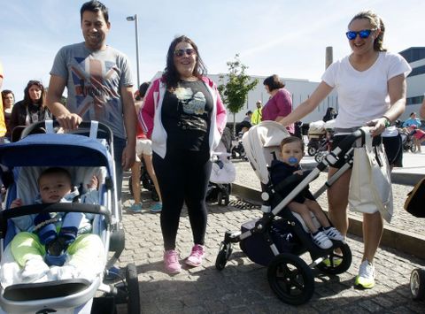 Son las once de la mañana de un soleado domingo y Roque, un niño de poco más de un año, mira atento todo lo que pasa a su alrededor. Está en A Illa y, en cuestión de minutos, la plaza se ha llenado de papás y mamás y de carritos de todas las formas y colores. A su lado está Xoán, un bebé de poco más de un mes, que mira sorprendido a su padre desde su sillita. En la plaza están también Valeria y Julieta, que comparten carro y cansancio. «A ver si se quedan a dormir pronto», confían sus padres. Con su carro todoterreno parecen ya profesionales en esto de ejercitarse en familia. Breixo y Brais también comparten un vehículo similar, mientras que su hermana Naír viaja en otro. Todos han venido preparados para la ocasión, con ropa cómoda, viseras y hasta gafas de sol. También los papás están listos y dispuestos a darlo todo en este particular paseo.