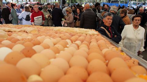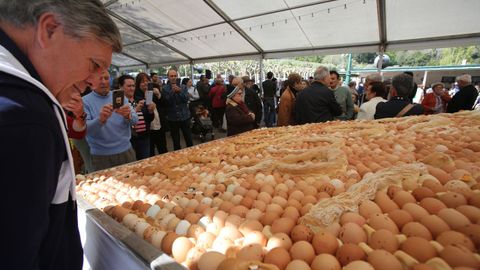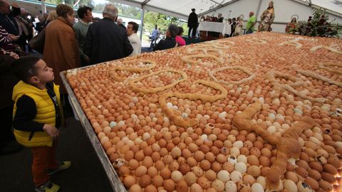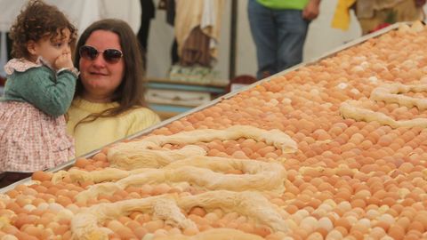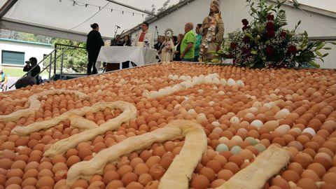 07 abr 2024 . Actualizado a las 19:45 h.Desde hace treinta años, la celebración de San Gregorio tiene en Paradela (Meis) un descomunal protagonista: un bollo de pan de once metros cuadrados que coronan seis millares de huevos. Una veintena de personas se encargan de su elaboración y horneado, en los que la panadería Paradela emplea siete horas. No es extraño que los asistentes a la romería hiciesen cola este domingo para tomar fotografías de la descomunal ofrenda, mientras el párroco pedía rezos a viva voz para alcanzar las alturas.