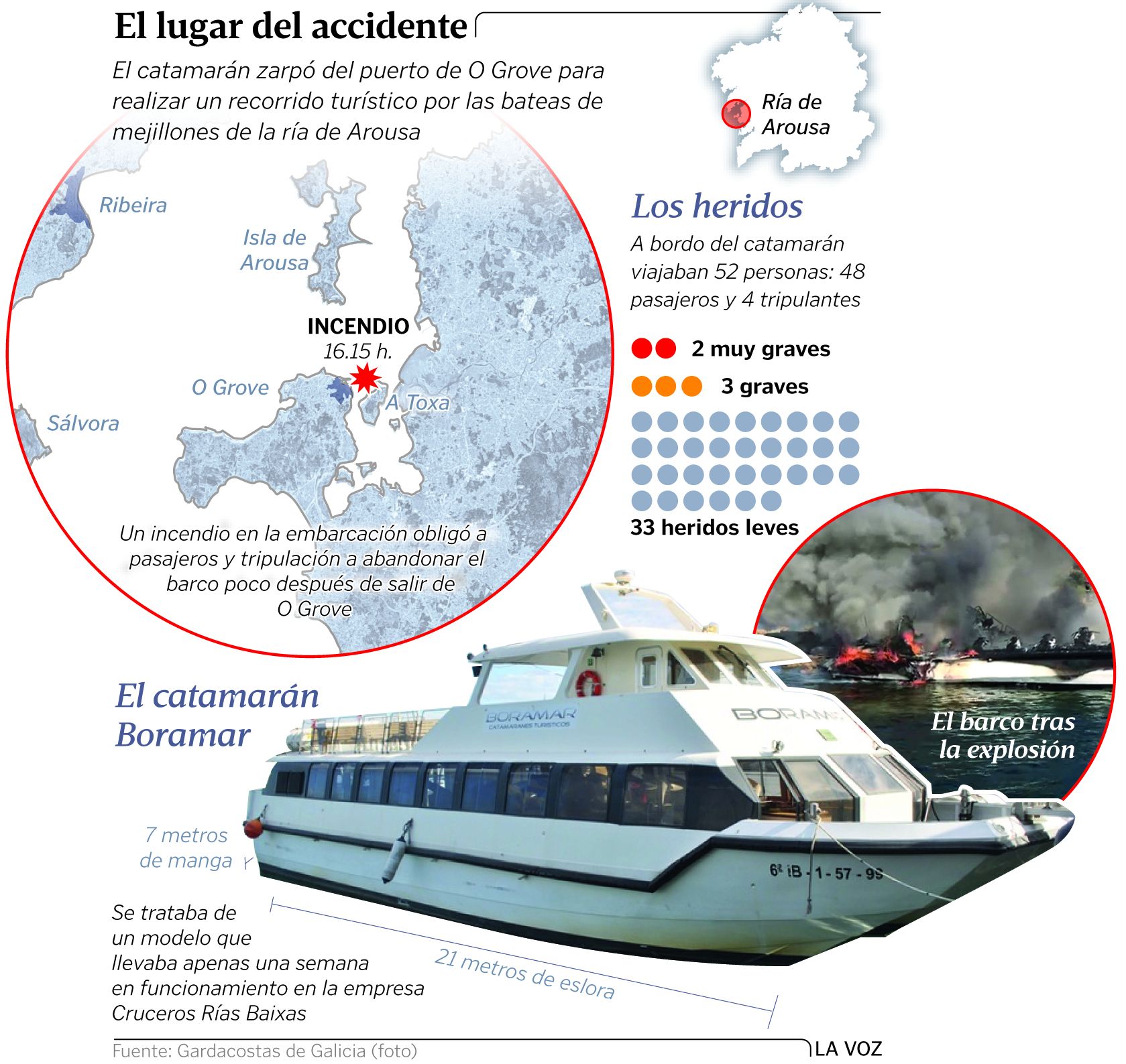 «Acabábamos de salir de puerto y nos estaban dando una explicación sobre qué son las bateas. Sonó como un disparo y empezó a salir fuego, pero pensamos que era uno pequeño, de los que se pueden apagar», explica la vecina de Majadahonda. Inmediatamente, el patrón tomó el mando y dirigió a la gente hacia la parte delantera. «El fuego y el humo salían por todos lados, había llamas muy grandes y mucho humo, no se podía respirar. Hubo un momento en el que pensé que moríamos todos», relata. Ella tenía claro «que no quería morir quemada», así que se deslizó por la visera del barco hasta el agua. Se quemó una mano en el trayecto. Desde el agua veía que sus hijos y su marido seguían a bordo: «Y yo solo pedía a los de las barcas que vinieron a rescatarnos que le dijeran a mi familia que se tirara. Hemos vuelto a nacer hoy», explica.