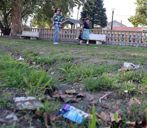 Pero los restos de todo tipo de objetos de plástico aparecen por doquier, como si alguien se hubiese dedicado con paciencia a sembrarlos por la superficie de la zona. Son los restos de los excesos de las fiestas, dicen los vecinos. La estampa no es muy edificante. «Á xente parece que lle costa traballo usar as papeleiras», dice una mujer que vive por la zona. Y es que papeleras hay. E incluso también hay una bolsa de plástico, colgada de cualquier manera, en los listones de colores que rodean el parque infantil. Hasta él no ha llegado, de momento, el caucho: los niños de Trabanca siguen jugando en medio de la grava.