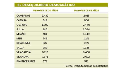 El balance conjunto de los once concellos indica que en Arousa viven hoy 18.130 niños y jóvenes frente a 23.942 personas mayores que han sobrepasado la clásica edad de la jubilación. Se trata de una brecha de 5.812 arousanos, que desequilibra la pirámide poblacional sin que, de momento, nadie haya dado con la fórmula para al menos frenar un fenómeno que avanza año a año.