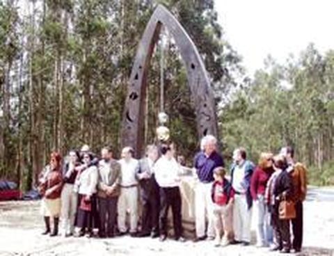«Este crisol da memoria ficará aquí para animarnos a unificar os nosos soños e ser máis xenerosos coa nosa historia; non podemos estar toda a vida vivindo do pasado, edifiquemos outra Noia sen rencores para que sexa o crisol dos sentimentos e non a desidia da alma». Con este deseo, recogido textualmente en su discurso, Alfonso Costa resumió el significado que él imaginó para la escultura que corona desde ayer el terraplén en el que estuvo antes instalada la ecoplanta, en Sampaio. La pieza, de 700 quilos, es una combinación de hierro, bronce, acero y piedra, que se forjó entre Barcelona y la comarca noiesa, con la ayuda de Andrés Carollo y Javier Ponte. La iniciativa, que tiene un coste de 12.000 euros, partió del ejecutivo noiés y se enmarca en un proyecto de regeneración de la Mancomunidade Serra do Barbanza. La ubicación elegida, al pie de la carretera comarcal 543, es un lugar clave. La obra de arte descubierta ayer tiene dos caras: una que da la bienvenida a Noia al viajero y otra que le dice adiós en su partida. O crisol da memoria representa para el autor una ventana gótica, con un marco más corto por un lado -el que evoca el pasado- que por el otro -el del futuro-. El visitante se encontrará de frente, al abandonar Noia, con unas marcas gremiales que harán que no se olvide nunca del patrimonio local. Si se dispone a penetrar en la cuna de Avilés, se topará con formas de estrellas, la luna y la Vía Láctea que le recordarán que la senda del peregrino no culmina en Compostela.