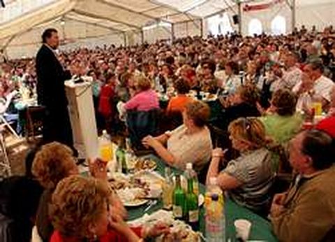 28 abr 2007 . Actualizado a las 07:00 h.La familia popular crece, como se demostró ayer en la romería celebrada en Ribeira. Desde críos hasta mayores, pasando por adolescentes y maduritos, se dieron cita en la carpa instalada junto a los juzgados. El lleno fue tan impresionante que hasta Torres Colomer se disculpó con quienes tuvieron que comer fuera del entoldado, como un grupo de simpatizantes de Lousame y Noia, porque, literalmente, dentro no había sitio ni para digerir de canto. Ya lo dijo el presidente nacional del PP, Mariano Rajoy: «Si llegan a poner diez carpas como estas, también las llenamos». El PP ribeirense debió de pensar que en un sábado soleado de primavera muchos miembros de la familia conservadora preferirían buscar refugio en la playa. Se equivocó. Había dos mil sillas, tantas como invitaciones -obtenidas previo pago de diez euros- y al final comieron tres mil personas, todas sentadas. Eso sí que fue una proeza. No se sabe cómo, el equipo de la pulpería Veloso, contratada para preparar y servir la comida, sacaba mesas y bancos de un camión que parecía la chistera de un mago. Cuando bajo el toldo no quedaba ni un metro cuadrado libre empezó a ocuparse el recinto exterior. A las tres de la tarde todos tenían plato y asiento, pero a las cuatro llegó un grupo de cincuenta personas; treinta minutos después, desembarcaron otras dieciocho, era una cadena sin fin. Las cifras hablan por sí solas, 1.200 kilogramos de pulpo, novecientos de carne, quinientos de patatas. El encargado de dar de comer a tanta gente, Manuel Veloso, ni se inmutaba ante las noticias de una afluencia que superaba todas las previsiones. Venía ten preparado para lo que fuese que hasta le sobró pulpo para haber dado de comer a otras seiscientas personas. Lo suyo sí es profesionalidad, cosa que no debe extrañar en una persona que asegura haber nacido en la feria de Santiago. Con tanta asistencia de gente inesperada la romería bien pudiera haberse convertido en un caos, pero lo cierto es que camareros y cocineros hicieron un alarde de eficacia, y eso que empezaron la jornada laboral a las siete de la mañana. Si el éxito del encuentro será recordado durante años, entre otras cosas porque los tres mil posaron para una foto de familia en la plaza del Centenario, tampoco se olvidará lo que se convirtió en el chascarrillo de la comida: los refrescos eran de la marca Feijoo. Veloso asegura que es una empresa de Padrón y que no estaba preparado.