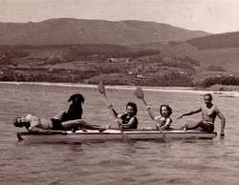 Buque lanzal que descansa na invernada a carón dos bocois de antigo bacelo. E de toda a tripulación, unicamente a cadela ten días de mar, pese a preferir con moito o rego do boi. Racharían as augas movementos rítmicos, vagarosos, repousados, seguros como o elevarse dun peito feminino na respiración protectora. Pero a pose é sincrética, de extremos desequilibrados e centro artificial -metáfora dos tempos que están por vir-, imaxe que despois aledará as reunións de café en La Coruña ou nos madriles. Anos trinta nunha Barraña case deserta, non afeita á folganza de señoritos felices (son os irmáns Del Río, do pazo de Fonteneixe; elas amosando o digno escorzo das modelos; eles estirando a fibra bufa dos sportman). Tempos de veraneo nos chalets da redonda, de faladoiros nocturnos, bailes privados e excursións á praia -se cadra como esta-. E tamén de inevitable estancia en Compostela, para ver a familia, para cumprimentar os amigos, para escapar do atordamento que produce demasiada vila e demasiada aldea. A fotografía, a non ser pola ascética presencia da paisaxe, hoxe inverosímil, podería situarse no mar arroupado do Sardinero ou na baía refrescante da Concha, onde o navío, de nobre e acariñada feitura con sapiencia de ebanista, atravesaría as augas escintilantes entre xente de moito mérito . Pero é Boiro, e o can, que identifica ao retratista e calcula a comenencia da súa lealdade, devece aínda por volver a terra. VERANEO NA PRAIA DE BARRAÑA. Augas escintilantes baixo un sol de morneza despreocupada, nos aínda calmos anos trinta. Tripulación de señoritos e un can almirante.