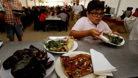 Foron moitos os que se decidiron por esta opción e, desde ben cedo, formáronse colas para mercar os tiques cos que logo se recollían as racións de empanada, mexillóns e xoubas. Grupos de amigos, parellas novas con cativos, xente maior e mozos compartiron espazo, ben baixo a carpa instalada no Campo de Arriba ou ben á sombra das árbores.