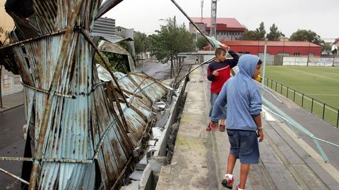 Los vientos huracanados derribaron árboles y el tejado de las gradas del campo de fútbol de Aguiño