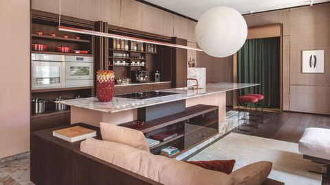 La característica principal de este diseño es el empleo de materiales nobles cuidadosamente seleccionados. La cuarcita natural se emplea tanto en encimeras como en suelos y en el mueble bar.