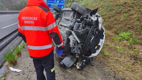 El turismo en el que viajaba la conductora quedó completamente volcado y ella pudo salir por su propio pie del vehículo. Una ambulancia del 061 la trasladó al hospital do Barbanza.