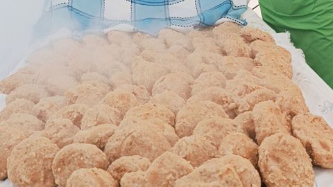 Los bolos se servían en un plato de cerámica de Buño a un precio simbólico de 3 euros y acompañados de trozos de panceta, oreja y chorizo. La cola de personas que aguardaban para probarlos atravesaba prácticamente toda la plaza, reflejando el interés de vecinos y visitantes por disfrutar de esta tradición gastronómica única en la comarca.