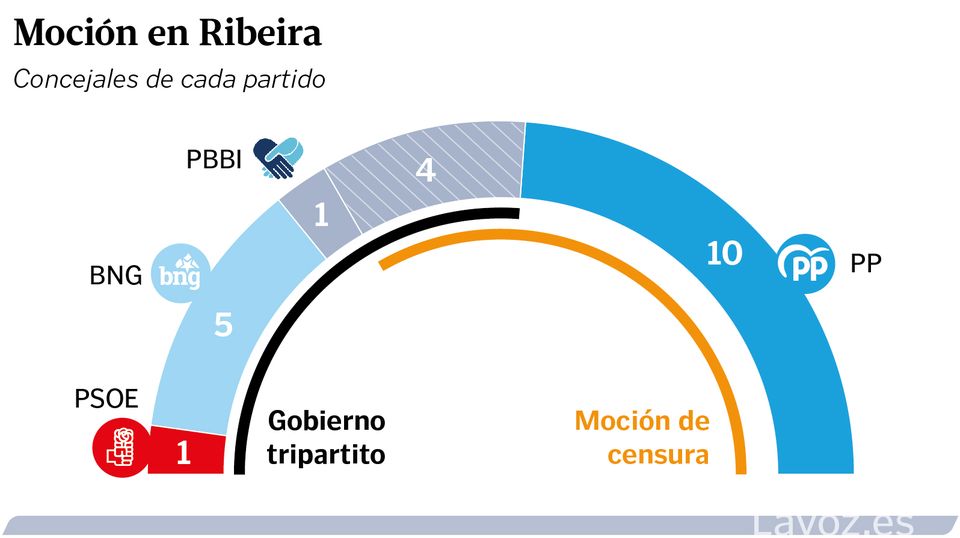 El escrito está firmado por un total de 14 concejales de la corporación ribeirense, por lo que a los diez con los que cuenta el PP se han sumado otros cuatro de los cinco con los que cuenta el PBBI (Partido Barbanza Independiente), el partido de Vicente Mariño de Bricio, que ya militó en su día en las filas del PP. Así, junto a Mariño firman la moción Herminia Pouso, Tania Redondo y Fernando Abraldes, y solo el actual edil de Sanidade, Juan Luis Furones, se queda al margen de la decisión de su grupo.