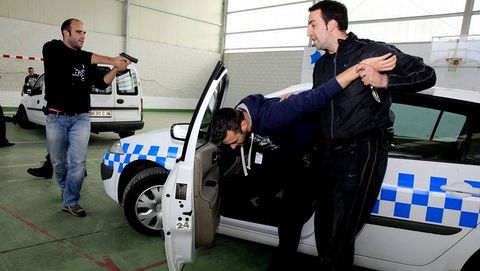 El escenario escogido fue el pabellón del instituto larachés Agra de Leborís. Allí había agentes que apenas superaban los 18 años hasta algunos que sobrepasaban la barrera de los 50. «El objetivo es actualizar conocimientos, explicarles a los agentes técnicas básicas de trabajo. No se trata de convertirlos en unos superhombres, sino que actúen con la cabeza y no con el corazón», comentó el instructor coruñés.