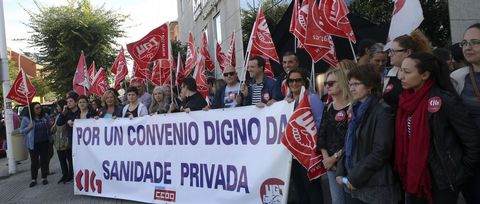 04 oct 2016 . Actualizado a las 05:00 h.Alrededor de un centenar de personas se concentraron ayer ante el hospital HM Modelo, convocadas por las centrales sindicales CC. OO., CIG, y UGT, para protestar por el bloqueo de la negociación del convenio colectivo de la sanidad privada, que afecta a unos 4.000 trabajadores en A Coruña. Una gran parte son empleados del grupo madrileño y de los hospitales Quirón, San Rafael y del Centro Oncológico, en la ciudad, así como del Juan Cardona de Ferrol, las clínicas La Rosaleda y La Esperanza de Santiago, y de las decenas de centros odontológicos, de oftalmología, laboratorios y consultorios de las diferentes especialidades existentes en la provincia.