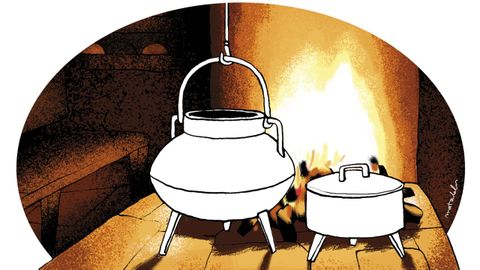 La cocina era donde se convivía y se pasaba la mayor parte del tiempo. El pavimento era más o menos llano, hecho de arcilla natural o de losas de granito. Al fondo estaba la lareira, formada por grandes losas de piedra, que podían medir 2,50 x 1,50 m, y levantada del suelo unos 20 ó 30 centímetros. Sobre ella estaban las estrepias (trébedes) y las ollas. Había fuego casi todo el día (antiguamente el fuego no se podía apagar, por superstición) bien fuera para hacer la comida para las personas, para calentar el agua en el pote para hacerle la encaldada a los animales o para calentarse los huesos cuando se llegaba frío o mojado de las labores del campo. Al horno se accedía desde la lareira, (el horno en sí estaba adosado a la pared por la parte de afuera) y debajo de la puerta estaba a borralleira, hueco donde se depositaba la ceniza. Y sobre ella se levantaba una gran chimenea (las que la tenían) apoyada en las paredes y en o pé dereito (columna). De su interior colgaba la gamalleira (utensilio para colgar el pote). En un lateral estaba o saleiro, especie de cajón con tapa y respaldo que servía de banco y al mismo tiempo para guardar la sal, la sartén, el puchero y alguna que otra cacerola. Detrás do saleiro estaba o graseiro, alacena donde se colgaba los tocinos y los untos una vez retirados de la sal, y o unllar, lugar donde se depositaba la leña para el fuego.