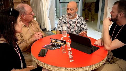 08 oct 2023 . Actualizado a las 05:00 h.Entre el 30 de agosto y el 1 de septiembre del 2024 se celebrará la 42.ª edición de las Festiletras de O Couto (Ponteceso) y la organización ya está enfrascada en su planificación. Es por eso que una representación de este festival acudió estos días a la Fira Mediterrània de Manresa: «A Fira traballa co patrimonio inmaterial e a herdanza cultural, pasando polas asociacións de cultura popular e tradicional, que traballan a partir do patrimonio inmaterial conectándoo coa sociedade, e por último, o sector profesional, os artistas que crean a partir desta tradición», apunta Adrián Varela. En la imagen, junto con Xosé María Varela, durante una reunión con productores portugueses conociendo artistas del país vecino. A Manresa acudió una importante representación artística de Galicia, con espacio también para la Costa da Morte. He ahí, por ejemplo, Caamaño&Ameixeiras.