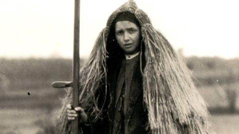 Lo que no olvidaré nunca, fue la primera vez que yo vi una caroza. Fue en una ocasión que fui con mi padre a por un par de bueyes que había comprado por la zona de Salto, y que pasamos por Señoráns. Al pasar por esta aldea me llevé un gran susto. Íbamos los dos en la misma yegua, bajo la lluvia, y alarmado le dije a mi padre: «Mira, mira cómo se move ese pallota». Era un hombre o una mujer que llevaba una caroza, hecha de juncos. Le envolvía totalmente hasta los zuecos, y como se movía de espaldas a nosotros no se le veía la cara. Mi padre me explicó lo que era y que él también la había usado, pero yo nunca la había visto.