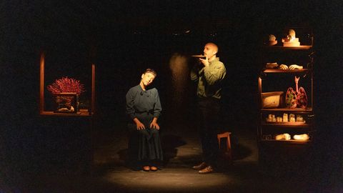 Conto isto porque a estrutura, a posta en escena chea de obxectos, que recorda eses laboratorios científicos decimonónicos, esa cálida luz e ese ton profesoral destas Entrañas, de El Patio Teatro, parécese moito a Conservando memoria, da mesma compañía, que xa vimos noutro OTNI en 2019. E se naquela se preguntaban cando nacía un recordo ou qué ingredientes necesita unha vida para ser extraordinaria, aquí dannos unha clase maxistral sobre o corpo humano, dende os pés ata o cerebro. E como ben din, se somos moito e apenas nada, só podemos encher o espazo de preguntas para saber, por exemplo, se a nosa pel ten memoria.