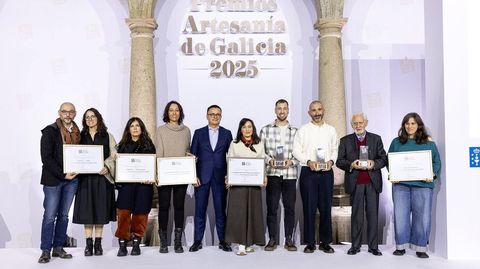 A ellos, al merecedor del Premio Traxectoria —Antón Corral, de Tui— y a los beneficiarios de las becas Eloy Gesto los felicitaron los conselleiros de Emprego y Facenda por su capacidad de innovar en materiales y técnicas partiendo de la tradición. José González, titular de Emprego, también destacó su labor en el marco de un ámbito artesano que destaca, dijo, como generador de empleo, vertebrador del territorio y fijador de población, especialmente en el rural.