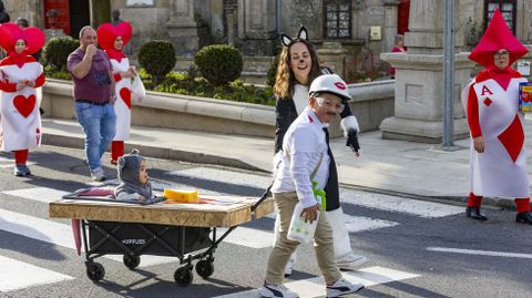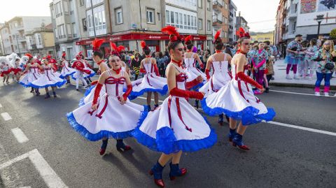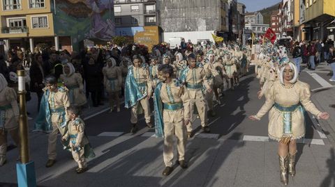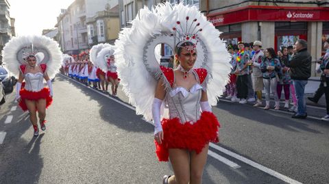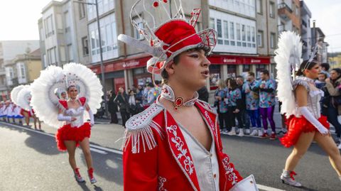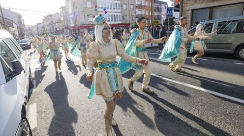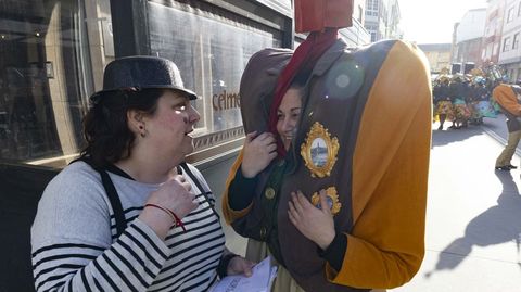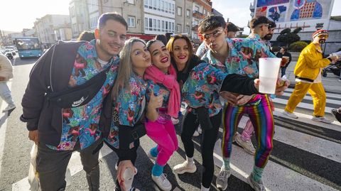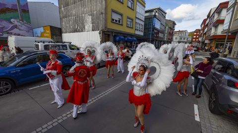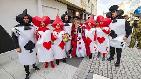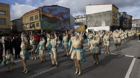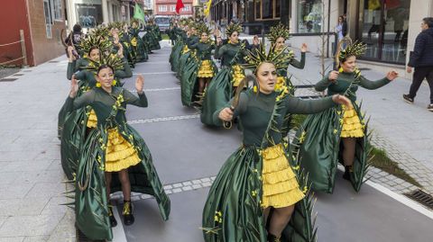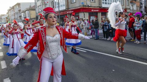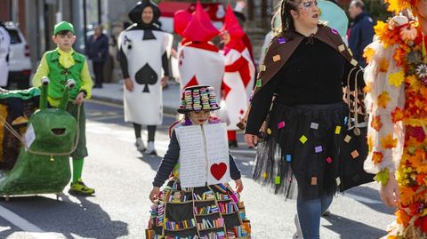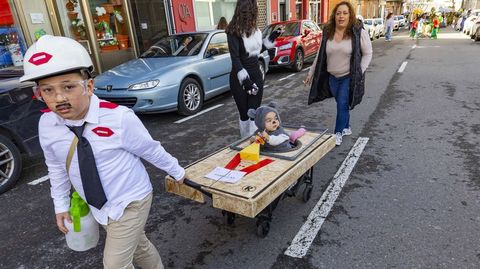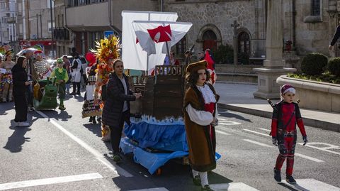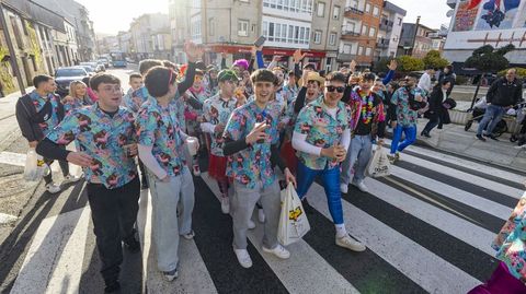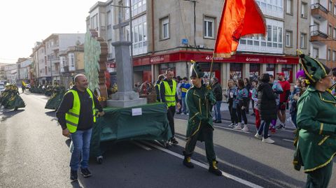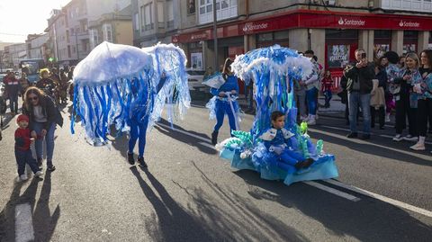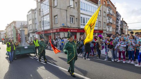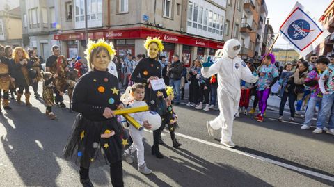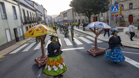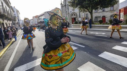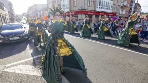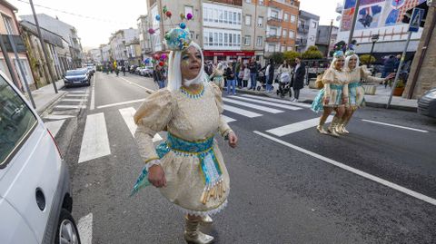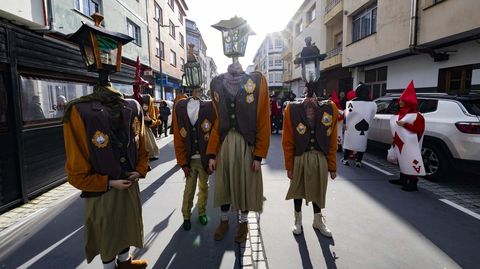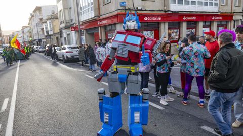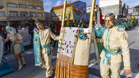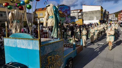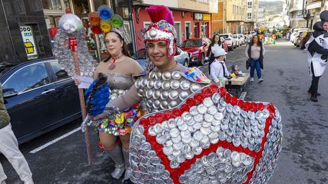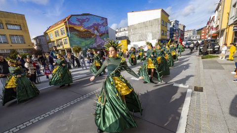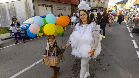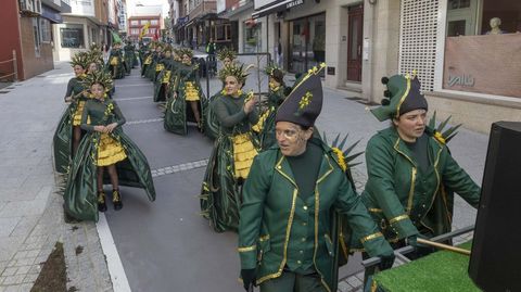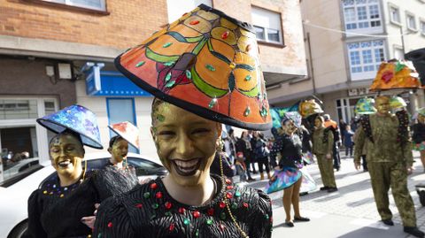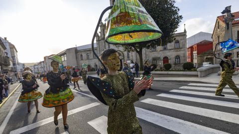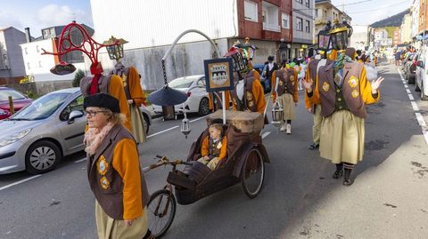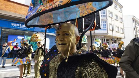 No menos lo trabajaron las formaciones comarcales. «Este ano saen 62 obras de arte, 62 lámpadas diferentes», contaba Sonia Amigo desde la asociación Trubisquiña, la entidad que está detrás de la comparsa A fábrica da luz, inspirada en las lámparas Tiffany. Es un poco guiño «á fabrica da luz de Vimianzo» y también al apagón, 62 propuestas que lucen integrantes de 5 a 65 años, muchos con lazos familiares, explicó minutos antes de salir en desfile. Han trabajado desde octubre y la imitación de las luminarias es de lo más lograda, todo a mano. La lucirán este domingo en A Ponte do Porto y Carballo, el martes en Camariñas y Arteixo y, a partir de ahí, dependiendo de si hay alguna mudanza por la lluvia, sopesan Oleiros, Noia, Baíñas, Cee, Padrón... «É un traballo moi grande que temos ganas de desfrutar», decía Sonia.