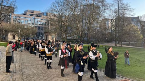 Desde bien temprano, los grupos A Roda de Lausanne y A Irmandade Galega na Suiza recorren las calles más emblemáticas de la ciudad, llevando consigo el alma de la emigración gallega. Sus trajes tradicionales, el sonido profundo de la gaita y la energía contagiosa de sus temas han ido marcando el pulso de una jornada histórica. Cada plaza se ha convertido en escenario improvisado, cada esquina en punto de encuentro intergeneracional. Mayores que reconocen melodías de su infancia y jóvenes que redescubren el legado cultural comparten espacio en una celebración que trasciende lo musical para convertirse en afirmación de identidad.