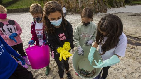 Niños de los colegios laracheses limpiaron ayer la playa de Caión, mientras que estudiantes del instituto de Baio hicieron lo propio en Traba (Laxe)